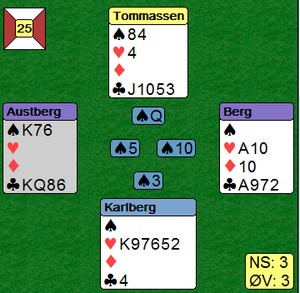 Jeg ga Jan Tore Berg storveies skryt for å spille en liten spar to ganger og dermed vinne 3NT i spillet under. Kurt Ove Thomassen spilte på akkurat samme måte og vant også kontrakten i sin kamp.