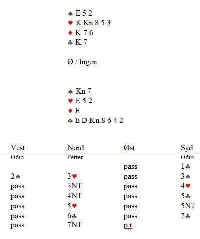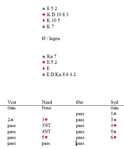 Odin skulle altså meldt 5NT i stedet for 6hj og Petter hadde vist fram kløverkongen sin med 6kl.