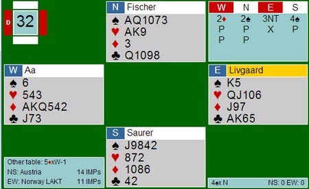 På det andre bordet havnet Ungarn NS i 4kl. En kontrakt som sto i ti stikk. 130 + 150 = 280 og 6 IMP.