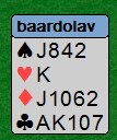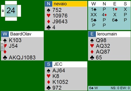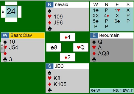 Jeg liker å vandre rundt på BBO og kikke på kjenningene mine spille kort. Titt og ofte ser jeg flotte prestasjoner, men den i går var over gjennomsnitt for å si det mildt. Her er kortene: