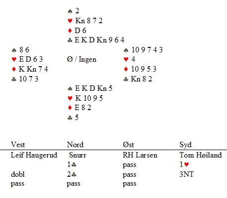 Leif Haugerud spilte ikke unaturlig ut ruter til damen som stod. Så fire ganger spar og tre høye kløver. Nå var det mange kort igjen, men Tom claima og sa "Resten står på en tosidig skvis.." Motparten vet at Tom har rett når sier sånn, men for skams skyld måtte han spille noen kort til. Her er posisjonen med tre kort igjen.