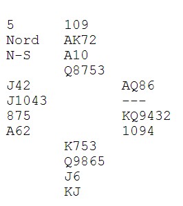 Italia meldte 4hj i det andre bordet og der var det ti lette stikk. Tor og Geir var med til 5kl etter at Tor valgt å være med til 4kl i øst. Geir visste ikke hvem som hadde kortene og meldte 5kl. Ser du alle kortene koster dette 500 og er ingen katastrofe mot 420. Det kan se ut som Tor spilte på at syd var renons i kløver (nord har da Kx) og prøvde å gå inn på ruterkongen for å ta kløverkappen. Syd stakk med ruteresset og så spilte de fire ganger spar for å forfremme kløverkongen til stikk. 800 mot 420 er mye verre.