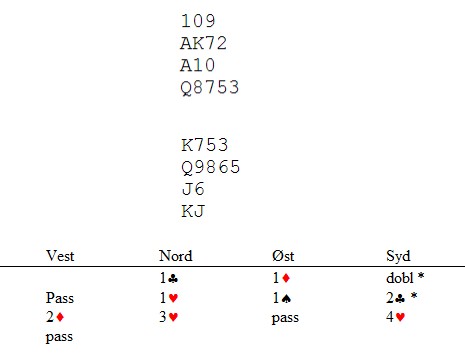 B: Du tror at øst er så god at han har kløverknekten, men bare tasser i hjerter. Da spiller du hjerterdamen til kongen og esset. Nå ser du hvor viktig det var å ha igjen ruteren for å kunne stjele deg hjem og ta en ny hjerterkapp på nieren.