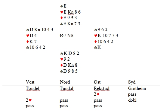 Han var spillefører i 5ru etter at øst hadde meldt spar og vest støttet. Vest startet med spar fem stjeling på hånda. Ruter til esset avslørte dårlige nyheter, men Helge ga ikke opp. Han tok hjerterkutten og spilte en liten ruter til øst som fridde seg med hjerter konge til esset.