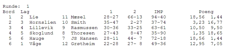 Møre og Romsdal (Lie) henta nok en fin seier og det samme gjorde Hauge. To av favorittene har fått en god start. Vest-Agder 1 leda med 54 IMP(!) mot Hornslien ved pause, men trønderne slo grusomt tilbake i andre og utligna. Mer kommer...