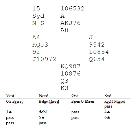 Når Helge hadde vurdert hånda til å være verdt en dobling første gang, fulgte han nå opp med 5sp. "Trumfen min er litt vesen, makker. Kan du hjelpe meg der?"