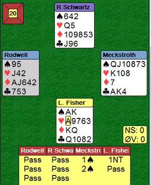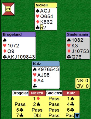 Til venstre melder Boye på en måte jeg ikke har sett han gjøre før. Det normale er som til høyre, der Rodwell sperrer med en gang og makker løfter et hakk. Fisher i syd var i trøbbel og gjentok sparen sin. Burde nord løftet et hakk? Så til Boye. Han lar motparten finne spartilpassen før han melder kløver. Over 6sp tar han sjefsavgjørelsen og stamper helt på egen hånd. Rett denne gangen, men er ikke dette enmannsbridge, Brogeland? |