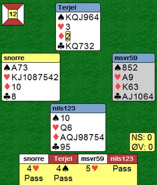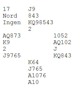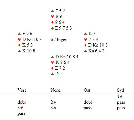 Dette er kortene du ser når spillet starter og i begynnelsen av spillet har du ikke så mange alternativer. Det kommer hjerterdamen ut til esset. Du må prøve å få stjålet hjerterne dine i bordet, så du stikker med esset, spiller nieren til kongen og stjeler en hjerter lavt. Det går bra. Så kløver ess, kløver til stjeling og siste hjerter til spar syv i bordet. Øst stjeler over med kongen og spiller ruterdamen. Nå er det din tur. Se på meldingene. Øst sin dobling er responsiv og viser en hånd han vil melde med, men har ingen dekkende meldinger. Typisk 4-4 i minor og litt tilpass til hjerter. Han har ingen femkort farge i kløver eller ruter. Vest har meldt 3hj med firekort-farge. Han ville opplagt meldt minor hvis han hadde hatt det, så derfor er fordelingen hans 3-4-3-3. Vest har K96/K93 i trumf og øst har K6/K3. (Med K9 i øst hadde han stjålet med nieren) Henger du med så langt, så vet du hva du skal gjøre med ruterdamen. Aktuelt stakk syd med esset og spilte spar damen. Vest stakk med esset, tok for ruter kong, ruter til makkers knekt og den trettende ruteren forfremmet spar ni til beita. Dette kan du håndtere og lasjerer ruteren to ganger. Da kan ikke øst komme inn for å spille den trettende og vest får ikke trumfhøyningen sin. |