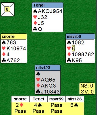 hei Snorre Syd som ikke såg sitsen i spar fridde seg med hjerter knekt og 8 til Vidar`s 10, jeg saka spar 2 og 6. Vidar tok nå for kløver A og spillefører måtte sake en spar. Spar Q gikk til mitt ess og ruter 6 i retur stakk syd med knekt så jeg fikk de 2 siste på 10 8 i ruter.