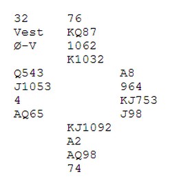 "Blir du skviset, Terje?" Oftest er jeg tilskuer til at Nils og Terje både melder og spiller fint, men i dette spillet fikk jeg tatt litt tilbake. Terje spilte ut ruter til kongen og Nils sitt ess. Så spar ti tilbake, Jeg visste nesten at når jeg la liten ville Terje kunne stikke over og gi makker en røff, men det er jo ikke sikkert at de ser det samme som jeg ser. Uansett måtte jeg gi bort to stikk for å få tempo til en mulig skvis, så derfor la jeg liten på spar 10. Terje kunne nesten ikke se at makker hadde åtte ruter, så han lot selvsagt Nils beholde for spar to og ventet på en ruterstjeling. Ruter kom tilbake men jeg stjal med knekten og tok to ganger trumf. Da stilte jeg Terje spørsmålet over fordi spar 7 funka som trussel på hånda og EKn i kløver var trussel i bordet. Vi spilte altså bare seks kort før vi claima. |