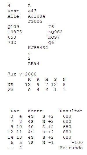 Offensivt av landslaget. De fleste åpnet med 3ru i nord. Da gikk det pass i øst og 3NT i syd. Vest hadde et rimelig naturlig sparutspill og ni stikk. Nils Kvangraven satt i øst og vet at en passer seg ikke til topps i parturneringer. Han doblet opplysende med tynne verdier og ble belønnet av en flink makker i vest, Helge Stornes. Helge startet med kløver og da var det 300 fine inn på ØV. 4sp kan vel vinnes selv med kløverstjelinga, men to dobla beit var alle poengene. |