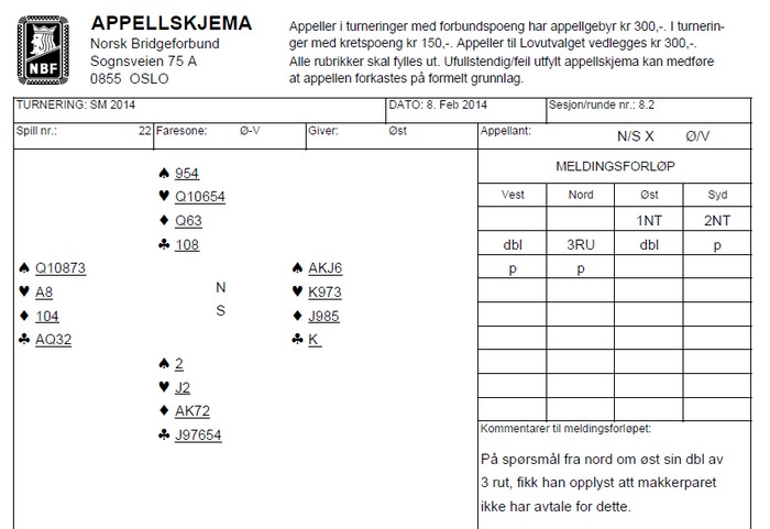 Peter Marstrander mente at om han hadde fått vite at øst hadde fire trumf, kunne han fått et stikk til. Double Dummy analysen til "Deep Finesse" sier at dette ikke stemmer og øst sier at han alltid kunne holdt syd ned på det antall stikk han aktuelt fikk. Syd hevder at for å klare det, måtte øst/vest levert et godt motspill. Det er nok grunnen til appellen.