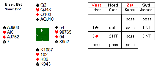 Eit dårleg spel for lag PGAH? Nei då. Den andre vest måtte altså sjå motparten melde seg opp i 3 grand, sjølv om han hadde 17 stål på handa. Med ruter ut må det bli beit, for vest får sett opp ruteren før speleførar får sett opp sparen. Det må vel vera meir sannsynleg at makker har tri ruter og to spar enn omvendt, så ruterutspel peikar seg ut i mitt hovud. Men vest valde ein spar, og dimed kunne ikkje Anne Lene Krogh-Vennemo Johnsen (turneringas lengste personnamn) gå beit i den steinharde utgangen. 7 IMP til lag PGAH.