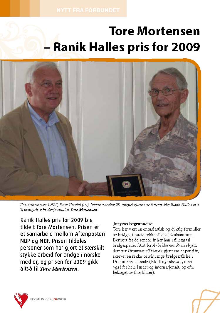 Ranik Halles pris for 2009 ble tildelt Tore Mortensen. Prisen er et samarbeid mellom Aftenposten, NBP og NBF. Prisen tildeles personer som har gjort et særskilt stykke arbeid for bridge i norske medier, og prisen for 2009 gikk altså til Tore Mortensen. Ranik Halles pris er den høyeste utmerkelsen en norsk bridgejournalist kan motta. Norsk Bridgepresse gratulerer Tore Mortensen med den høyst velfortjente prisen.