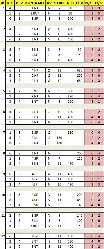 Olav Vaagen forteller oss at i kveld var det 3 bord på onsdagens kursbridge. Det ble spilt 12 spill og resulatlisten ble som følger: