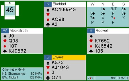 men det er mye lettere å finne dårlige spill i skrive om. Det er langt mellom breathtaking bridge-prestasjoner, uansett hvilket nivå en snakker om. Mange av feilene skyldes manglende avtaler eller enda verre, uklare avtaler. Innhopp med 2NT etter motpartens åpning har før vært definert som minst 5-5 i de to laveste umeldte, men siden 1kl-åpning hos mange par kan være helt nede på singelton, er det kanskje like greit å la fargen være "umeldt". I alle fall er det viktig å ha diskutert dette med makker: Meckstroth - Rodwell hadde ikke avtalen på plass og da kosta det 2000 i åtte hvite beiter i 7ru. 980 i 6sp på det andre bordet var en fin kontrakt, men -14 IMP likevel Jeg har en mistanke om at mange par har for mange avtaler og at siden de fleste av oss ikke spiller bridge på heltid, er det krevende å være helt fokusert i et 200 sider stort kompendium. Dette håper jeg coach Geir Olav Tislevold bruker tid til å formane sine disipler før sommerens EM. En må ikke gjøre ting verre enn det er og i alle fall slutte å endre systemet i god tid for turneringa. Ingenting er verre enn å ikke huske om posisjonen som dukker opp skal dekkes av en ny eller gammel avtale. Når jeg bakspiller de norske parene, er det for kort mellom dyre meldemisforståelser. For paret eller laget er det lite nytte i å skylde på at "Det var makker som husket feil". Resultatet blir ikke bedre av den grunn. Husk at får en først en misforståelse, koster det blod og det kan gå mange kamper før systemet klarer "å betale tilbake"