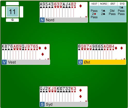 På spill 11 mandag 14. var vi alt annet enn misfornøyd når tannlegen doblet oss i 1 spar slik at vi fikk korrigert oss inn til toppkontrakten 2 spar. Legg merke til at dersom Eirik ikke dobler så blir det tungt for Terje i syd og bidra med noe annet enn 1NT. Med 5-3-2-3 i nord er det der og der om man passer eller melder 2 spar, mest normalt er det vel og passe. Slik gikk det ikke og vi kom i den koslige 2 spar som alltid må gi mer stikk enn 1NT. Den gang ei!