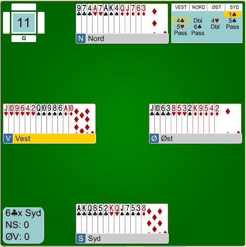 I dette spiller ville utspill av kløver gitt beit. Da finnes det ingen vinnervarianter for Syd. Hva slags avtaler har du når makker har meldt og du støtter og til slutt dobler motpartens kontrakt på slemnivå? Ber det om utspill i deres farge, ber det om annet utspill f eks Lightner? Slike avtaler er greit at de sitter. På sommerbridge spiller vi med forksjellige makkere stort sett hver gang og da kan det bli utfordrende å spille ut når slike ting ikke er avtalt. Makker spilte Spar ess ut og da var katastrofen et faktum.