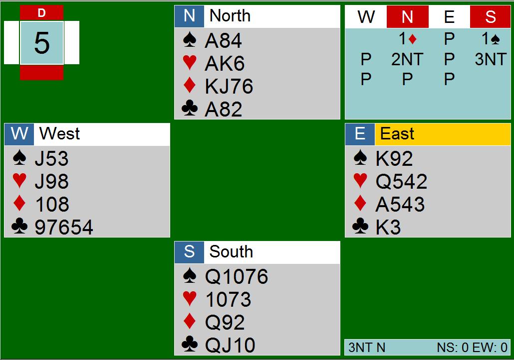 I Fosnavågen hadde vi fornøyelsen av å spille både par og lag med Rune Skodje, noe som var en hyggelig opplevelse. Vi hadde som avtale at vi spiller helt enkelt og at vi bruker bordfølelse og intuisjonene vår når vi kom opp i ulike situasjoner. Svært lite systemavtaler med andre ord. Når det kommer til det å føre korta så er Rune en mann man alltid har måttet gjort regning med, så også i denne 3NT som han spilte i lagturneringen mot Henning Korsvoll og Kjell Frydenlund fra lag Øst-Vest.