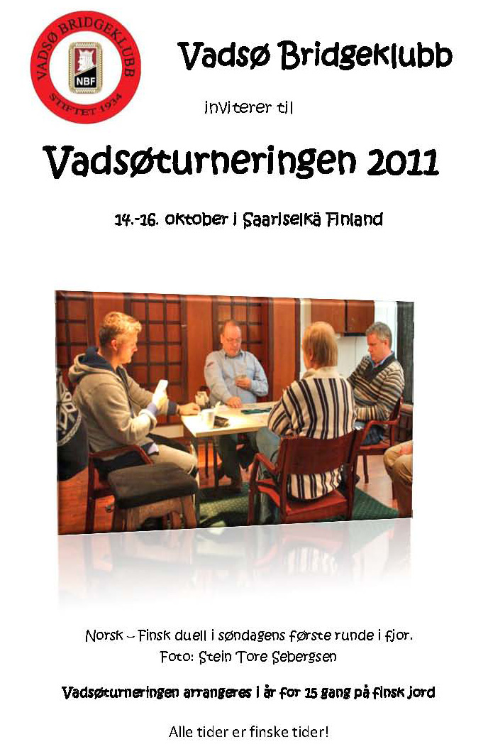Elisabeth og Hege har tenkt å gå spille alternativ turnering Tirsdag 4. Oktober. Dette betyr at våre damer(Ja bare damer), som er relativt ferske i Bridge, skal få en gjennomgang. Det blir benyttet fasit spill (Spill som tidligere er benyttet i en stor turnering), og score blir beregnet ut i fra denne turnering. Målet er selvfølgelig ikke at man skal komme høyt på denne turnering, men det er fint å ha en fasit. Håper at flere vil delta på dette.