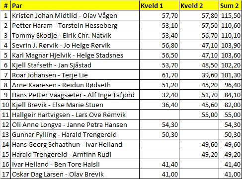 OBS! Siste spillet er scoret feil, da NS har notert + 170 i 2 spar. Det rette skal være 2 sp i vest med 10 stikk= 170. Dette medfører +/- 1-2 poeng på flere par, mens par 6 får - 8 poeng og par 12 + 8 poeng. Resultatet er rettet i sammenlagtarket ikke i BK soft.