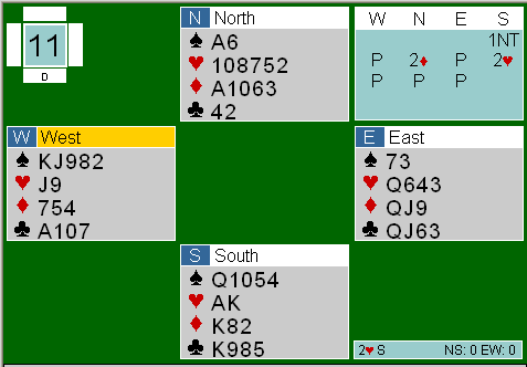 Liten spar kom ut til kongen i syd, og jeg la spar dame. Inge spilte liten spar til min nier, og Helge sin ess. Helge la ned kløver A og ny kløver. Jeg turde ikke annet enn å stikke med kongen.. Så var det å telle poeng. Med hjerter dame, har Helge 11 poeng.. Spilte hjerter til esset, og hjerter til kapp med knekten.. Så hjerter konge, og all trumf var ute. Inge kastet ruter på den siste trumfen.. Tok for spar knekt, og kastet en ruter på hånden. Spilte så liten kløver til trumf, hvorpå Helge la damen... Spilte så min siste trumf for å se om jeg fikk telling. Helge legger lett damen i kløver, selv om han har Q-10 .. Helge la en liten spar på min siste trumf, jeg la en ruter i bordet og Inge kastet nok en ruter. Da har jeg K10 i ruter, og kløver 9 i bordet. På hånd har jeg Ajx i ruter.. Spiller så liten ruter til kongen, og nord syd følger på med små ruter.. Spiller ruter 10 fra bordet, og Inge følger med nok en ruter.. Finner ut at her ikke er en skvisvariant, og at Inge må ha kløver 10 og en ruter igjen, mens Helge må ha ruter Q og en spar igjen.. Går så opp på ruter A, og kontrakten går hjem... Etter en litt tung dag, ble det iallefall en opptur til slutt.