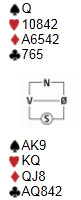 Når jeg spiller med flinke makkere, ønsker jeg å gjøre lite feil. Det er til syvende og sist resultatene som teller, men det har noe mer prestisje å gjøre også. Her er et spill fra rundekampen i dag og jeg har testa min avgjørelse på flere av landets absolutte elite. Espen Lindqvist: "Huff da!" Jan Tore Berg: "Er ikke du en enkel sjel da?" Kaninen: "Stakkar liten!" Nils Kvangraven: "Ingen stopper i delkontrakt når jeg krever til utgang.:" Roald Mæsel: "Jeg stiller meg 100% bak Kvangraven" Jeg er ikke sikker på om du er enig med min andre melding, men logikken er at med svake 6-4 hender, gjentar du sekskort-farger og melder firekort-fargen etterpå. Hvis du melder 1 ruter-2kløver-3ruter, så har du samme fordeling men en sterk hånd. Det er ikke jeg som har skrevet dette, men gjør bare som noen har lært meg. 2sp er utgangskrav , 3kl og 3ru støtte. Når jeg melder 3hj er vi i min (enkle) verden inne i en cuebidsekvens. Jeg viser en hjerterhonnør dobbel og har derfor nesten alltid 1-2-6-4. Så melder makker 4ru? Hva gjør jeg da? Når du leser innledningen, så skjønner du at jeg passet (!) 4ru med begrunnelsen at makker har ikke spar ess og heller ikke EK i kløver fordi da ville han kontrollmeldt en av de fargene. Nå står det ( i mitt hode) ikke 5ru uansett hvor mye vi har krevd til utgang. Eller hva skal makkers 4ru ellers bety? Her er hele fordelingen og selv om alle eksperter ler av meg, så si meg hva logikken bak 4ru er, hva jeg skulle meldt og hvorfor. snorre.aalberg@hotmail.no Så til spørsmål B. Du passer ikke og havner i stedet i 6ru men en liten spar i utspill. Hvordan spiller du? Nils Kvangraven spilte en god rundekamp mot Farsund, men det ble jevnt etter å ha ledet med 34 IMP halveis: Det holdt såvidt til avansement..