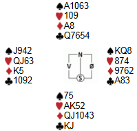 Jeg hadde gleden av å spille med Thomas på tirsdag. Thomas gikk kurs i fjorhøst, og har vist seg å ha et fint talent for spillet. I spillet under hadde vi havnet i 1nt, og Thomas var spillefører i syd. Ut kommer liten hjerter fra vest