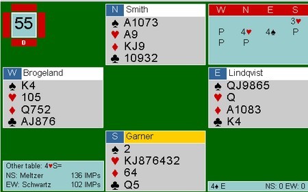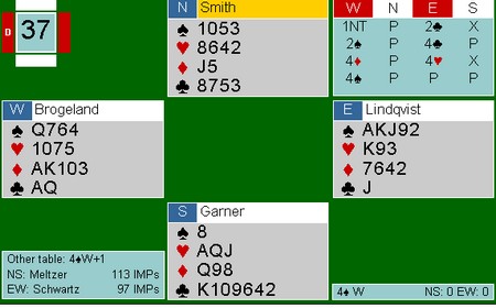 Nationals kan bli avgjort av kvaliteten på sponsorparet. De må spille to sesjonen (32 spill). Schwarz har Allan Graves og Richard Schwartz, mens Monaco har Franck Moulton og Pierre Zimmermann. Det blir også spennende å se hvordan de bruker sposorparene. Det mest vanlige er at de spiller tidlig og ikke er med i de avgjørende 16 eller 32 spillene. Vi får se. Aller mest moro hadde det vært med Boye og Espen mot Tor og Geir i siste sesjon der resultatet hadde vært jevnt. Her er et fint spill av Richard Schwatz og Allan Graves. Slemmen ble ikke meldt på det andre bordet i semifinalen.