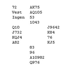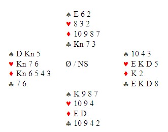 I artikkelen under denne ser dere at Helge Mæsel leker med kaninen i 3NT. I dette spillet fra samme runde tas det hevn. Åse Biribakken i vest starter med 1ru, Geir "kaninen" Brekka i nord dobler opplysende, Helge Mæsel viser sparen sin og vest avslutter meldingsforløpet med 1NT Geir i nord har ikke lyst til å starte med major, så han velger fint en liten kløver. De spiller ikke invitt, så Åse legger nieren som trekker esset. Spar damen får beholde stikket, men spar ti vinner Geir og spiller mer kløver til knekt og dame. Åse godspiller kløveren sin. Så mer spar til Geir sitt ess og han frir seg med hjerter dame (!). Bordet vinner med kongen og kan ta to sparstikk til. Når det spilles ruter, fræser Åse Langeland opp på esset, tar for den trettende kløveren og spiller hjerter til Geir. En beit !! "I love you beibi", sier Åse etter utspill og motspillskunst av Geir Brekka