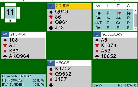 og Sverige vant 10 IMP mot Norge i denne slemmen siden Norge på det andre bordet stoppet i 3NT. En sving på 20 IMP for å finne hjerterdamen. Du ser kjapt at med spar ut, henger kontrakten på å finne hjerterdamen. Når spillefører starter med trumfen, oppdager han at syd er renons. Det er mye som tyder på at sparen sitter 5-4, med fem i syd. Da kjenner spillefører til syv av nord sine kort, men bare fem av syd sine. Derfor er syd favoritt til å ha flest hjerter og den med flest hjerter er også favoritt til å ha en manglende honnør. Det spilte svensken på og vant sin kontrakt ved å ta finessen i hjerter gjennom syd. Du kan kanskje si at siden syd meldte inn var det størst sjanse for at han hadde manglende honnører, men det er vel ikke noe i veien for at han har ruterdame i stedet for hjerterdamen. En annen ting er at de fire honnørene (alle damene f.eks) statistisk samler seg 0-1-1-2 på de fire hendene. Det ser du også stemmer i dette spillet.