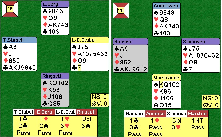 Jeg fikk ikke sett så mye på de første 16 spillene, men i dette var det gode vurderinger ved begge bord. Skal en vinne lagkamper er det helt avgjørende å lykkes i de store spillene. Peter Martrander får det tøft over 5hj fra Erik Berg, men ingen passer seg til seier i lagturneringer. Rune Andersen løfta til slem og Erik tok det sikre i 7hj. Tre hvite beiter var billig mot -1430. Legg merke til at du må spille kløver mot KDJ to ganger i 6sp, mend et er baremat for spillere på dette nivået. Steffen Fredrik SImonsen på det andre bordet visste ikke om makkers renons i hjerter og stoppa i 5sp. ØV trodde de skulle bli belønnet for å holde motparten vekk fra en iskald slem, men det både stemte og ikke stemte siden stampen i 7hj var så billig, Etter havltid er stillingen 30-21 til lag Stabell. Andre halvrunde