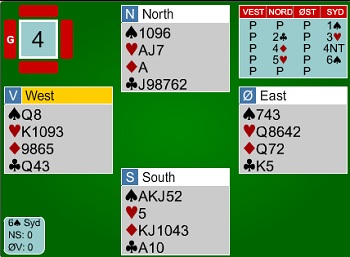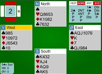 Utspillet var tre ganger ruter til stjeling i bordet, og deretter en kløver til damen og dukk fra Syd. Harald tenkte seg godt om og spilte på den eneste muligheten for hjemgang: Tre ganger trumf og kløver til Syds ess. Han hadde ingen ruter igjen, og dermed deilige 420 og 7 imp.