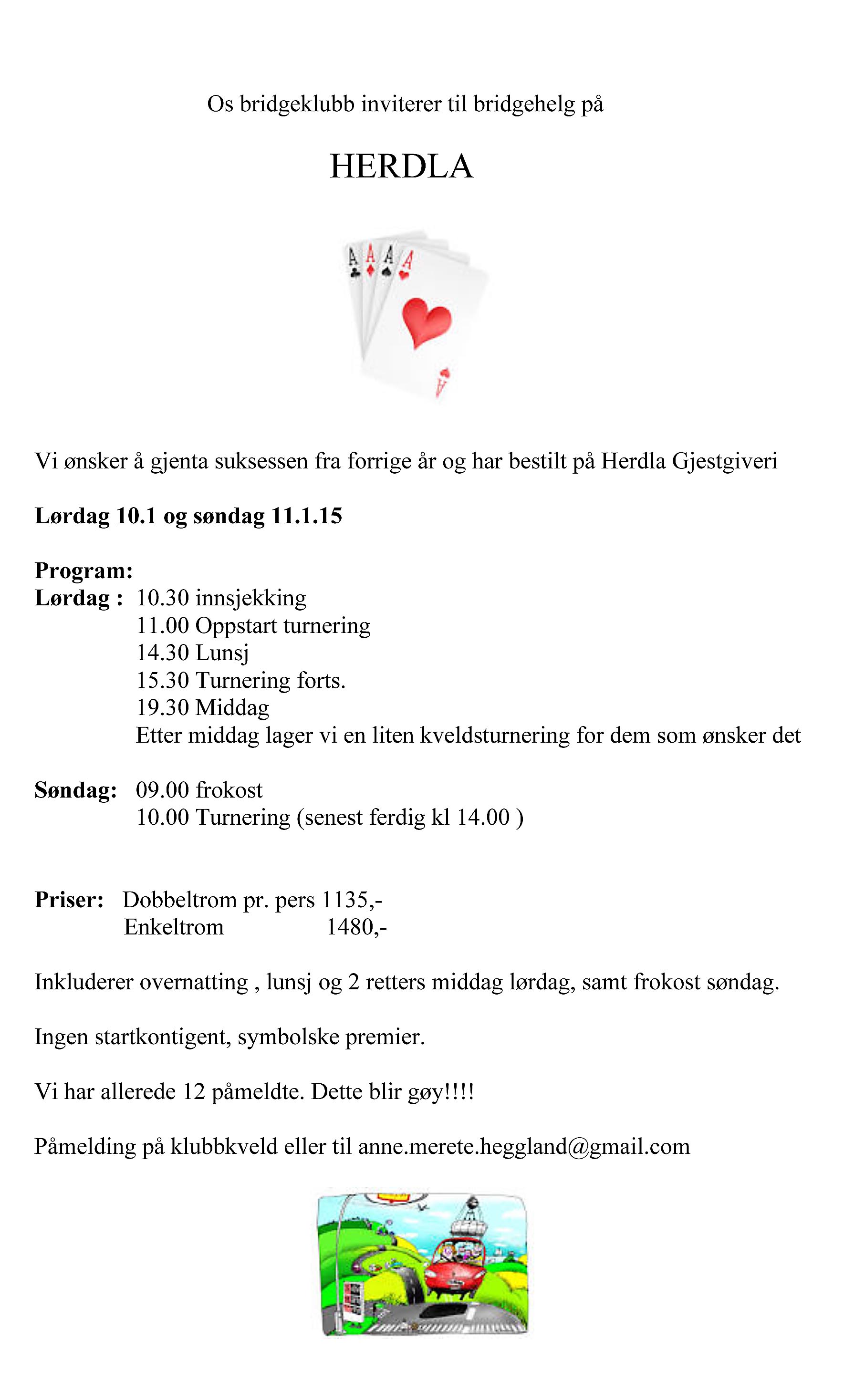 Så fort påmelding er mulig på bridge.no/turneringsweb vil jeg legge ut lenk til dette. Påmelding kan også gjøres til Trine Samuelshaug og Frank Foss.
