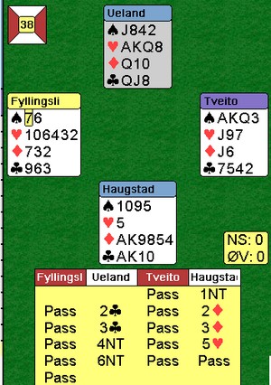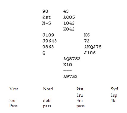 ______________________________________________________________________________________________ Kippe og Grude på vei opp og fram Det er ingen par som har scoret noe særlig. Å lede med 56,2% etter hundre spill, er lite. Dette betyr at det er mange par som er med i medaljekampen når dag to nærmer seg slutt. Selv de med middels enda, kan melde seg på hvis de får i gang sluttspurten. Stillingen etter 34 runder Helge Mæsel er god og myndig TL Nå begynner folk å bli slitne fordi gode spillere melder både fort og dårlig. Denne syd skal få være anonym, men han skammet seg etterpå. Nord viser "litt her og litt der" med sin dobling av 2ru. Da må syd på en eller annen måte komme seg i utgang. 4kl blir bare fight om kontrakten og alt for spedt. Jeg synes 4ru er en god melding som betyr at han har kort for utgang og minst to steder å spille. Aktuelt foreslår vel nord 4sp med dobbelton (har vel benektet tre i forrige runde). Det blir elleve stikk og hele +23 av 25. Selv 5kl med tolv ga +16. Ingen meldte slem, men det er vel ikke så rart. Pass er en undervurdert melding Når bridgespillere finner en steinhard utgang eller slem, roper mange over seg av begeistring. Når de samme tar en råsjans og gjetter på at makker har de ideelle kortene, blir de også (ufortjent?) oppskrytt når det lykkes. Å ta sjansen på at makker ikke har det som passer, er i mine øyne i samme kategori. Ofte kan det ligge en minst like god vurdering bak en pass.