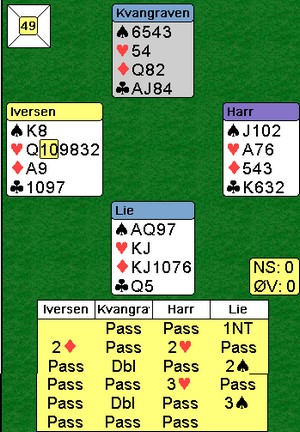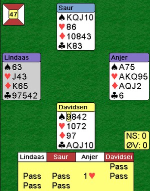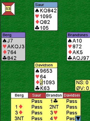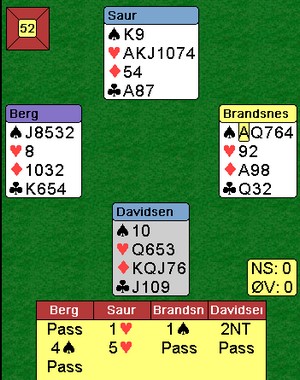 for det skjer hver gang jeg stiller noen spørsmål ved åpningsstrukturen i "moderne" bridge. Den andre i rekka av de som kaster seg over meg, er Gautis. Jeg hadde denne tamme hånda i syd og åpnet med 1kl (2+) som alle gjør: Kn98 E6 K1065 EKn98 Vest meldte inn 2hj og makker hadde ED7 432 DKn93 D72 og så kan dere eksperter fortelle meg hvordan dette skal gå videre. Du må gjerne gi han fire kløver eller 4-4 i minor også. Fem ruter og tre kløver er like ille. Skal vi ikke snart begynne å åpne med 1ru på dette, så har vi i alle fall vist en farge? Med åpningshånda jeg har kommer vi aldri, aldri i delkontrakter i minor, nesten uansett hva makker har der. Enten har vi åtte kort majortilpass ellers spiller vi NT. Jeg har tenkt å gjenmelde 1NT over 1hj/1sp, sånn at ikke noen tror jeg har tenkt å svare 2kl. Svarer makker NT, melder jeg selvsagt 2kl fordi da vet jeg at vi har åtte kort i en minor og minst en av majorene er svake. Jeg vet at jeg får kjeft, men det prelle like mye av hver gang inntil noen forteller meg hvorfor 1kl er så mye bedre.
