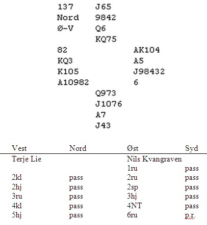 Jeg mener at mange toppspillere noen ganger (ofte?) gjør bridgen for vanskelig. Da jeg bakspilte i NM for et par uker sider, opplevde jeg flere ganger (etter min mening) at de beste parene meldte og meldte på hender der en av dem skulle tatt en praksisk beslutning tidligere i meldingsforløpet. Spesielt i parturnering skal ikke de beste jage de marginale utgangene eller slemmene. Det siste i særdeleshet. Vinner du tolv stikk på en skvis, skal det skje i utgang, ikke på 6-trinnet. Belønningen er sannsynligvis omtrent den samme med 90% score uansett. Straffen er middels i utgang de gangene de sto bare elleve stikk, men rein bunn for beit i slem. Her er et spill som viser hva jeg mener: Jeg tror utfordringen til par som jager det perfekte i sitt system, er at de klarer ikke å begrense hendene ovenfor hverandre. Ingen vil hoppe for å vise ekstra stryke siden det stjeler mye plass. Oftest svært riktig tenkt. Jeg synes det i spillet over er veldig hardt av vest å passere 3NT, men han vil helt sikkert argumentere med at øst har ikke begrenset hånda si enda. Øst kunne helt sikkert kunne hatt både ruterdamen og ruteresset i tillegg når paret enda var på 3-trinnet. Øst vil på den andre siden si at med betydelige ekstra ressurser ville han da tatt opp over en evt. 3NT. En annen ting er at gode par vegrer seg mot på melde NT når det ser ut som kontrakten spiller best fra makkers hånd. Øst ville ikke melde NT med singel kløver og vest ville i melde NT med to små spar. I teorien er dette selvsagt rett, men i praktisk bridge må en noen ganger melde praktisk. Jeg synes at en av dem rett og slett skulle meldt 3NT på et eller annet tidspunkt i meldingsforløpet. (På den annen side er det bare å flytte vest sin hjerterdame over til ruter, så er 6ru en glimrende kontrakt. Likvel tror jeg ikke paret "visste" at de meldte med tolv mot tolv og ingen voldsomme fordelinger på noen av hendene) 6ru er slettes ingen håløs kontakt med de kortene som er. Den står "bare" på å finne ruteren, men en god spiller som Nils Kvangraven vet at det er teoretisk rett å ta kappen. I dette tilfellet marginalt, fordi det ser ut som trumfen må sitte 2-2 siden en spar må stjeles. Det kan kanskje gå an å godspille kløveren for et sparavkast og at en da tåler EDx i syd? Per Elvin Pedersen var i 3NT i spillet fra øst. Der lå K105 i ruter i bordet og øst dro av gårde knekten. Nå syd la liten, tenkte arendalitten at da har han neppe damen og føyk derfor opp på kongen for 11 stikk og 22 av 25 mulige plusspoeng. Toppen gikk til Astrid Margrethe Grønnesby og Knut Jonny Tuseth som vant 6ru med rett trumfvalg. ________________________________________________________________________________ Så til overskriften og praktisk bridge. Det nye 1.divisjonsparet i Kristiansand er Jon Solli Hansen og Karl Christian Baumann. Jon er kjent for akkurat det jeg etterlyser over, en praktisk tilnærming til spillet. Hans styrke er ikke det meldeteoretiske, men han er god til kortvurdering både i meldinger, motspill og som spillefører. Jeg fikk en rein bunn, null prosent på -980, men det lever jeg fint med. Nord har bare ti honnørpoeng, men får vist kortene sine glimrende med 4kl-meldingen. Han spør ikke nødvendigvis om syd har maks eller min, men om det passer med singel kløver. Jon i syd ser at dette henger sammen og vet at alle hans verdier spiller på lag. Enkel, logisk og praktisk bridge. Etter spillet lo kaninen av syd sin åpning med 1NT. "Konsentrerte verdier og ingen gjenmeldingsproblemer gjør at dette er åpning 1kl," sier han. Jeg kan ikke være mer uenig. 1NT er en praktisk og god melding som gjør hånda ferdigmeldt i runde en. Joda, jeg vet at en ikke får tak i den femte kløveren hvis makker spør etter fordelingen, men hvis en åpner med 1kl vil en sannsynligvis få vansker med både å vise kløverfargen og styrken etterpå. Her hører jeg allerede noen systemteoretikere riste på hodet så den knaser i ryggvirvlene, men da kikker du bare på spillet øverst på sida og ser at vårt kanskje aller beste par sliter med å definere håndas stryke. Eller kanskje noen forteller meg hvordan slemmen meldes med styring etter 1kl i åpning og overføringer fra svarhånda?