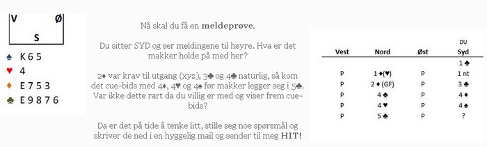 Når jeg leser slike "oppgaver", skjønner jeg hvorfor norske spillere og par går så mye beit i slemmer. Jeg passer 5kl hundre av hundre ganger. Ikke fordi det ikke kan stå 12 stikk, men jeg vet ikke hvor mange esser vi har. Og heller kan jeg ikke få undersøkt. I min verden er det å gamble når man tar en sjanse og gjetter uten å ha den ringeste anelse om oddsen sin. Joda, jeg har to esser i oppgaven under, men uansett hvordan en snur og vender på korta er og blir det en minimumshånd for 11-14 NT, i alle fall når du har vist fem kløver. Og når makker valgte å gå ned i 5kl kan jeg ikke skjønne at jeg har noe mer i bidra med. Gå inn på NILS KVANGRAVEN sin side og send inn svar du også.