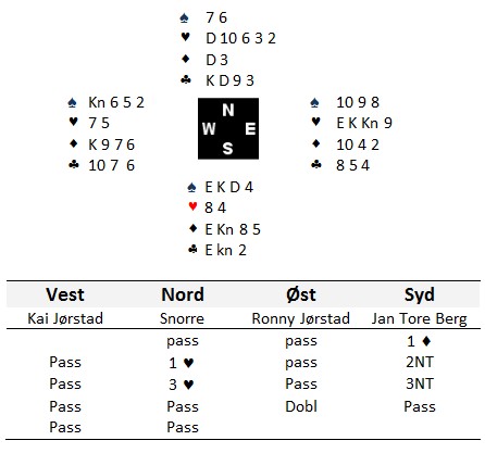 Som makker i nord tenkte jeg at nå har det klikka for Larvik-gutten, men av erfaring vet jeg at bak det som ser ut som en svært underlig plan, ligger det ofte som regel en genistrek. Ronny kom inn og kunne ikke ta mer enn tre hjerterstikk til sammen uten å godspille det niende i hjerter for spillefører. Han fortsatte i spar, men nå kunne Jan Tore farefritt ta ruterfinessen fordi forbindelsen til det fjerde hjerterstikket var brutt. Motto: Angrep er det beste forsvar!! _________________________________________________________________________ Taper på taper