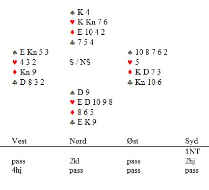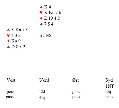 Begge spillerne i kampen tok for kløverdamen og satte seg så til å tenke. Du skjønner hva som skjer nå og kontrakten fyker hjem når du må spille til dobbeltrenons. Her er alle kortene.