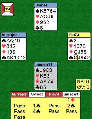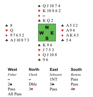 2sp = overføring til kløver. Ron Schwartz hadde vel ingen grunn til å starte med sparesset og mer spar, så ruteresset kom ut til stjeling på hånda. Hvis spillefører prøver å gå inn i bordet for å ta en hjerterkutt, vil motparten nesten alltid kunne sette opp en sparstjeling. I alle fall hvis han spiller spar, så alternativet må i tilfelle være kløverkongen. Curtis Cheek hadde ingen tro på at det kunne gå bra, så han la ned hjerterkongen fra hånda i stikk tre (!). Nå kunne ingen makt i verden beite han lenger!! Tøft, _____________________________________________________________________________________________