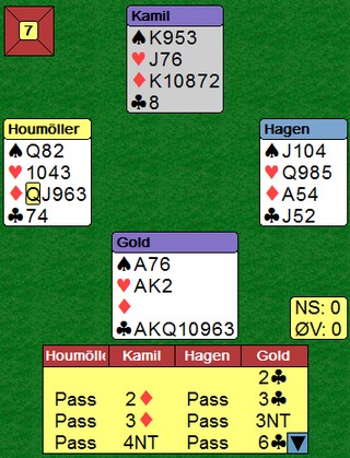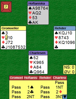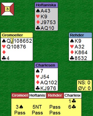 RESULTATER LAG Lag De Botton vant etter en dramatisk innspurt. Det så ut å gå Danmarks vei med to spill igjen, men først slo De Button tilbake i sin kamp mot Gillis med en steinhard 3NT som kunne vært beita, men i praksis ikke var så lett å finne rett motspill. + 7 IMP. Så tok lag Sinclair 18 IMP på Danmark i de to siste spillene og dermed en flott seier til Janet De Botton, Arthur Malinowski, Thor Erik Hoftaniska og Thomas Charlsen. Vi gratulerer. Her er de to avgjørende spillene. I stedet for en normal hjerter fra lengste og beste farge, starta Kamil- Sinclair med kløver 10 til dame og ess. Så skift til ruter. Nå måtte dansken ha løst sparfargen, men det klarte han naturlig nok ikke. Det var ikke så lett å komme fram og tilbake, men hadde han hatt en liten ruter i stedet for damen i bordet, tror jeg han hadde vunnet. Da ville han stukket med esset og dobbelkappa sparen. Nå slapp han ruteren til bordet og la ned sparesset for beit. Danmark stoppa i 5kl og tapte dermed en soneslemsving når sparen satt 3-3. Gratulerer tli lag De Botton!! Gratulerer til Torhild Heskje og Siv Thoresen med seier på bulteren! ___________________________________________________________ Skille mellom 4/5 og seks spar Det er mange par som har valgt at overmelding av motpartens innmelding 1ru/1hj etter makkers åpnng, viser hhv seks hjerter og seks spar. Dette fordi det sjette majorkortet ofte er så viktig, både for å vurdere egen kontrakt og når det skal spilles motspill. Jeg har forståelse for at Thomas ikke klarte dette motspillet når makker viste 4+ spar med sin dobling. Thor Erik fant et godt utspill med kløverdamen, men Thomas stakk og skifta til sparkonge. Spillefører vant og nord la fireren. Så to ganger trumf og ruter til knekten. Hadde du klart å skifte tilbake til kløver nå? Det tror jeg er nesten umulig, men hvis nord kunne vist sekskort spar ved å melde 2hj første gang hadde motspillet sagt seg selv. Thomas prøvde å ta et sparstikk til, men da rakk dansken å godspill ruter 9 til et kløveravkast. _______________________________________________________________________________________ Sånne lagkamerater vil jeg også ha