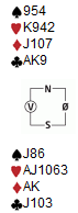 Jeg og makker tar rett som det er ei turnering på nettet, og sist kom vi over denne klassikeren. Til en forandring klarte vi å bremse i 3hjerter. Hvordan ville du ha dratt korta i denne etter at motparten tar de første tre stikkene i spar og vrir til ruter i fjerde stikk?