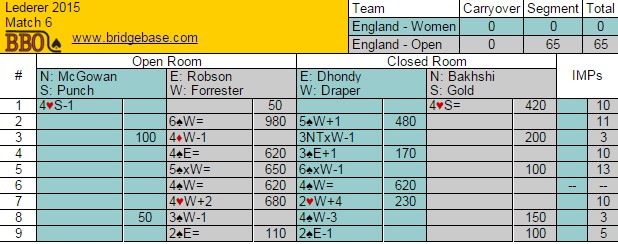 RESULTATER Det engelske landslaget med Andrew Robson, Tony Forrester, David Gold and David Bakhshi vant "Lederer" etter seier i alle kampene unntatt 23-25 mot Gillis. Nok et flott resultat med 2.plass til Janet De Botton sitt lag der Thor Erik Hoftaniska spilte med Dror Padon, en spiller jeg ikke kjenner til. Sånne lister vinner en gjerne turneringer med: Espen Lindqvist, Boye Brogeland og Espen Erichsen var invitert sammen med sponsor Simon Gillis. De ble nummer fem av de ti lagene.