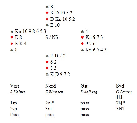 Jeg har prøvd i snart tretti år og endelig lyktes det!! Jeg startet med ruterdamen som "selvsagt" sto. Jeg kunne ikke se enda hvem som hadde dobbel ruter, men jeg visste makker hadde spar esset eller hjerteresset. Skift til spar i tilfelle spillefører måtte gjette den fargen. Knekten vant, men på hjerter fra bordet gikk Ronny Kollnes opp på esset, spilte ruter til mitt ess og ruter til stjeling. Det går sikkert tretti år til neste gang jeg lykkes, men det er verdt å vente. ___________________________________________________________________