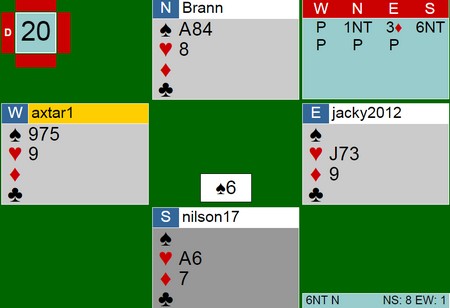 Mot 6NT kom det ruterkongen ut og i slike spill er det oblagatorisk å telle seg fram til et stikk mindre enn det en må ha. I dette tilfelle er det derfor rett å la ruterkongen beholde stikket for å ordne rett tempo til en mulig skvis. Øst skifta til hjerter i stikk to (uvesentlig)