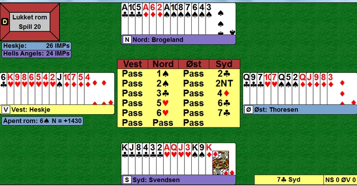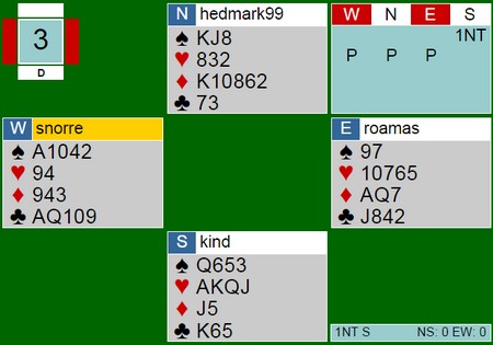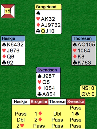 Siv Thoresen er ikke mørkredd og finner en fin stamp. 4hj står lett i elleve stikk, men selv om Tonje og Tone fant ruterstjelinga ga det bare +500. 4 IMP mot 650 på det andre bordet. Der passet Kristine Breivik og øst åpnet med 2sp. Nå ble det vanskelig å stampe. Så en liten systemsak jeg har sett flere misse på. Denne ble ikke så dyr siden 2sp heller ikke går hjem, men en annen gang er syd uten med en bløff. Doblingen av 1sp viser spar og da burdet vel Siv tatt ut 2hj til 2sp? When i doubts, bid once more.. er en god regel. Det blir ikke alltid rett, men jeg tror det er vinnende i det lange løp. I alle fall i dette spillet og Torild Heskje kunne se makker notere +650. 5hj koster 500, men for vest kunne dette vært et spill hvor det stor utgang begge veier, til og med på 5-trinnet. Slike spill MÅ vinnes, landslagsdamer!! Det er ikke meningen å henge ut enkeltspillere, men de som er i landslagstroppen må tåle å få kritikk når slemmer som er til å slenge i veggen spilles bort. Kontrakt 6sp og hjerter ut fra øst.