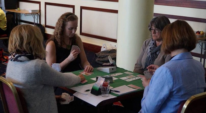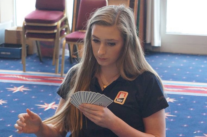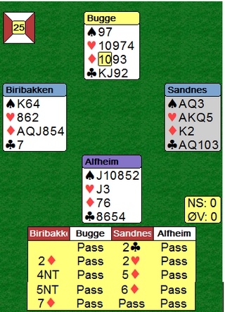 1 12 62,06 Heskje Heskje - Thoresen - Langeland - Breivik2 3 57,40 Hells Angels Holmøy - Vist - Svendsen - Brogeland3 14 52,16 4 HJERTER Moen - Hofnes - Biribakken - Sandnes4 2 51,64 Nærøysund Prestvik - Prestvik - Tuven - Halsen5 15 49,90 Advisor Revisjon - Norge Jenter 2+ Sjødal - Frøyse - Fossum - Sjødal - Nordbø Vi ser at to av de største favorittene allerede er i tet og møtes på Bord 1 i femte runde. Juniorjenter på en flott femteplass.I kamp to meldte Åse Biribakken og Siri Sandnes denne fine storeslemmen. Det ble rett av Siri Sandnes å ikke vise hånda si som en sterk NT, men heller begynne med 2hj. Åse Birikbakken kunne spurt etter hjerterdamen med 5ru, men satset på at den var på plass. På 5NT fikk hunruterkongen i svar og da var det mange sjanser til at det var tretten stikk i ruter.Selv om makker hadde EKDxx i hjerter er det rett å være i ruter eller NT. Liv Bugge rett fram og Siri Sandnes til høyre. Vi ser bakhodet til Åse Biribakken og Margot Alfheim Katarina Ekren - BAK og Norge