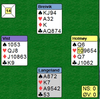 Jeg liker godt spill der en noen ganger må avvike fra det som er normalt. Å kjenne igjen disse situasjonen er ikke så lett, dessto mer tilfredsstillende de gangene en oppdager at det vanlige kortet ikke duger. Når jeg serverer dette som et problem, er det ikke så vanskelig. Ved bordet er det mye verre.