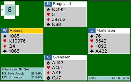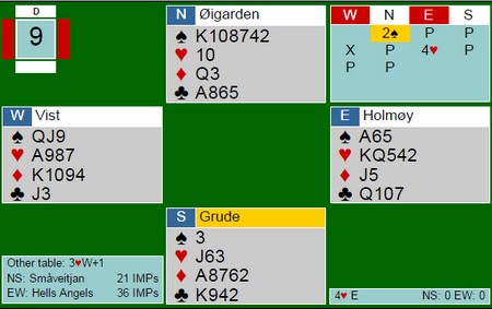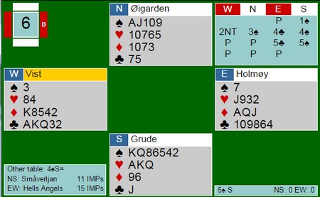 Denne artikkelen vil bli oppdatert etter hvert som jeg skriver om spill eller får inn fra dere. En vinner ikke bridge ved å passe.. I går skreiv jeg om et spill der Siv Thoresen med hell meldte seg på i 4sp uten særlig kort. I dette spillet var det Pernille Lindaas som fikk presset motparten et hakk opp. 5sp er en god stamp fordi 5hj står som et seil. Likevel 14 IMP ut mot 620 i 4sp på det andre bordet. Her avgjøres mesterskapet Skal en vinne turneringer og ikke bli nummer to, trengs det en porsjon glid i tillegg til gode ferdigheter. Isolert sett er denne slemmen ikke spesielt god, men hvem tenker på det når ruterdamen faller dobbel? Syd viste en 22-24NT med firekort spar og da er det vanskelig for Tonje i nord å stoppe under slem. De valgte 6NT på syds hånd i stedet for 6sp, Den beste slemmen om en skal være ute. Stine Holmøy stamper i ugunstig Det er sjelden noen god ide, men Stine ser at det er mange stikk i kløverkontrakt samtidig som hun neppe kan beite 4sp. Som jeg sa tidligere denne helga: "When it doubts, bid once more.." Syd turde ikke la ØV spille 5kl, for det kunne meget godt stå i elleve stikk. 10 IMP til Hells Angels som fikk spille 4sp på det andre bordet. Legg merke til at 5kl er en god stamp og går bare en beit (-200), så uansett aksjon fra syd er dette en sekser inn. Så enda et glimrende spill av Gunn Tove og Stine Trykk på spillet og se en flott spilleføring for ti stikk. (Spill 9 Åpent Rom)
